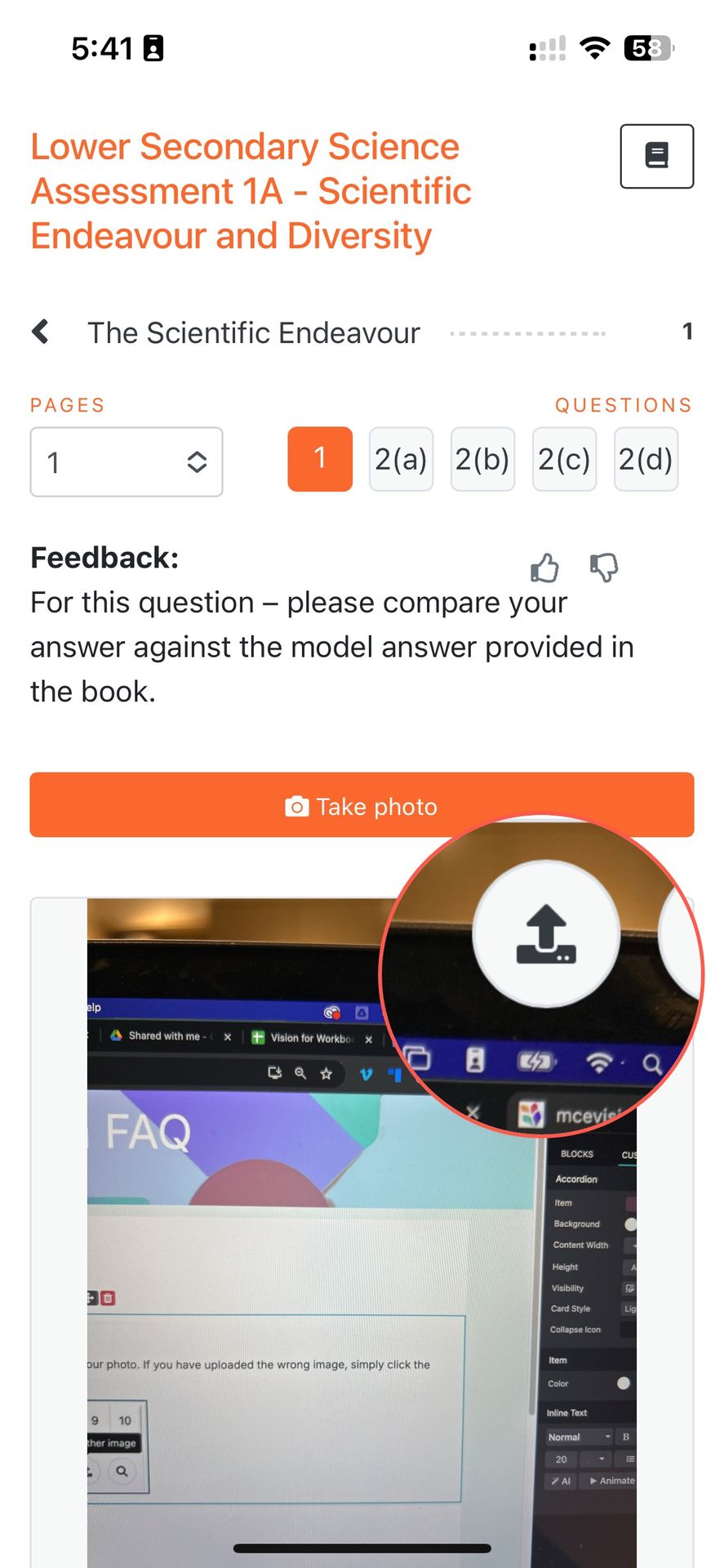 Vision shows you an image of the page that you are uploading alongside your photo. If you have uploaded the wrong image, click the ‘upload’ button (circled in the image) to upload a replacement image.